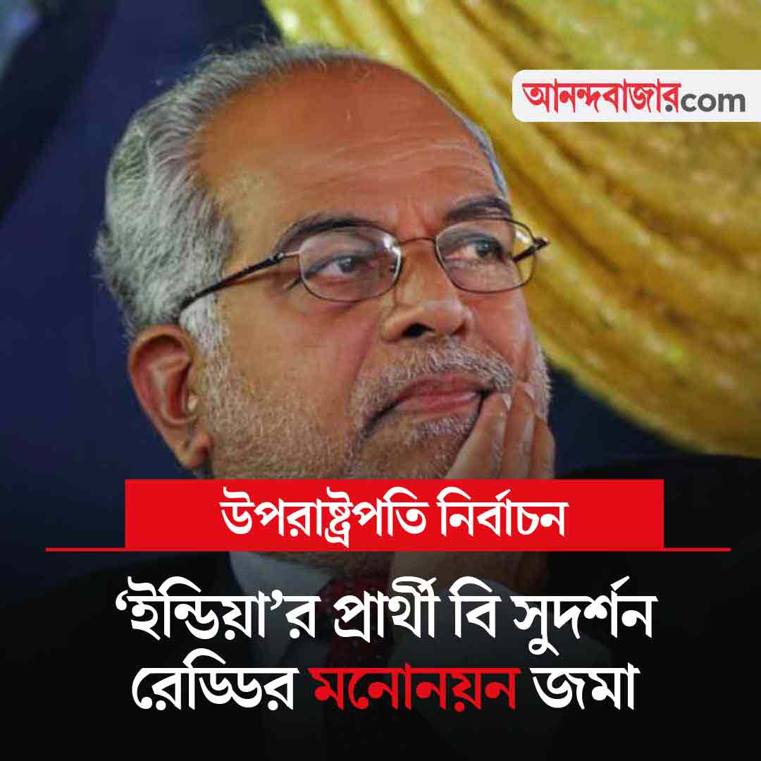 সুপ্রিম কোর্টের প্রাক্তন বিচারপতি বি সুদর্শন রেড্ডিকে উপরাষ্ট্রপতি নির্বাচনে প্রার্থী করেছে বিরোধী জোট ‘ইন্ডিয়া’। আজ তাঁর মনোনয়ন জমা দেওয়ার কথা। গত সোমবার সন্ধ্যায় খড়্গের বাসভবনে উপরাষ্ট্রপতি নির্বাচনের প্রার্থী বাছাই নিয়ে বিরোধী শিবিরের বৈঠক বসে। তার পরে মঙ্গলবার দুপুরে প্রাক্তন বিচারপতি রেড্ডির নাম ঘোষণা করেন খড়্গে। কেন্দ্রের শাসক জোট ‘এনডিএ’র উপরাষ্ট্রপতি পদপ্রার্থী সিপি রাধাকৃষ্ণন বুধবারই মনোনয়ন জমা দিয়েছেন।