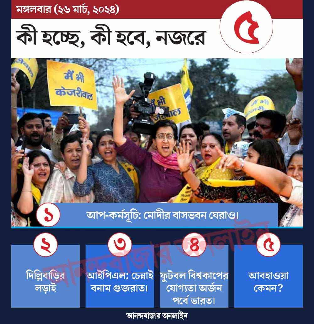 দিল্লির মুখ্যমন্ত্রী অরবিন্দ কেজরীওয়ালের গ্রেফতারির প্রতিবাদে আজ প্রধানমন্ত্রীর বাসভবন ঘেরাও করবেন আপের কর্মী-সমর্থকেরা। প্রশাসনও তৎপর। আপের এই কর্মসূচি ঘিরে উত্তাল হতে পারে দিল্লি। নজর থাকবে এই খবরের দিকে।