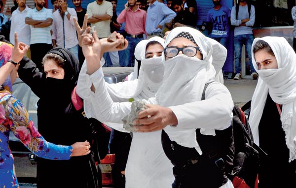 বিক্ষোভ: লস্কর নেতা আবু দুজানার মৃত্যুর খবরে পাথর হাতে রাস্তায় নেমেছে ক্ষুব্ধ ছাত্রীরাও। মঙ্গলবার শ্রীনগরে। ছবি: পিটিআই।