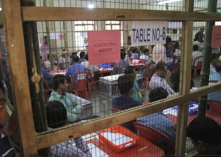 প্রতি মুহূর্তে বদলে গিয়েছে রং, গণনা কেন্দ্রের ভিতরেও টানটান উত্তেজনা ছিল ত্রিপুরায়। ছবি: বাপি রায়চৌধুরী।