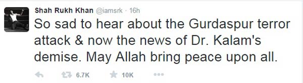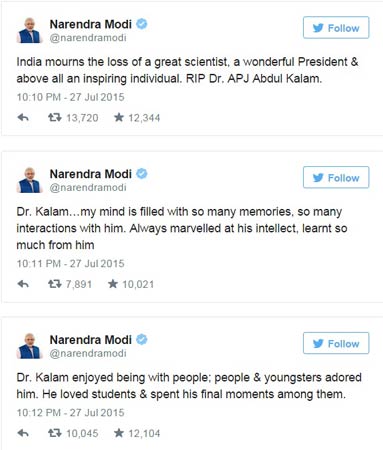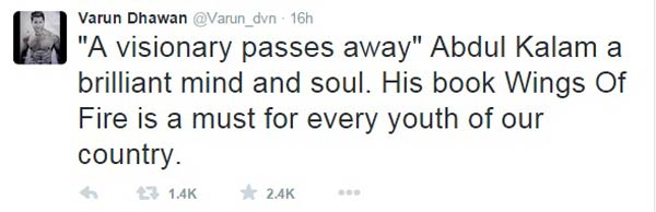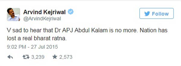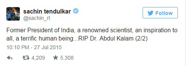 ডক্টর কালামের মৃত্যু নিঃসন্দেহে ভারতের এক অপূরণীয় ক্ষতি। তাঁর মৃত্যুতে যে শূন্যতা তৈরি হল, তা কোনও দিনই পূর্ণ হবে না। ডক্টর কালামের জন্য গভীর শোক প্রকাশ করি! তাঁর আত্মা শান্তি পাক!