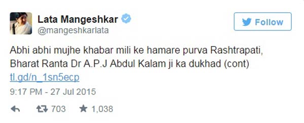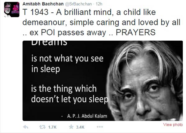 মহান বিজ্ঞানী, অনবদ্য রাষ্ট্রপতি, সর্বোপরি একজন অনুপ্রেরণাদায়ক ব্যক্তিত্বের মৃত্যুতে ভারত শোকস্তব্ধ। তাঁর আত্মা শান্তি পাক! ডক্টর কালাম... আমার মন জুড়ে এখনও শুধুই তাঁরই কথা... কত স্মৃতি... কত সাক্ষাৎ... যখনই দেখা হয়েছে, তাঁর পাণ্ডিত্যে বিস্মিত হয়েছি... অনেক কিছু শিখেছি ওঁর কাছ থেকে। ডক্টর কালাম সব সময়েই মানুষের সঙ্গে মিশতে ভালবাসতেন... বিশেষ করে তরুণ প্রজন্ম খুবই পছন্দ করে ওঁকে... ছাত্রদের উনি খুবই ভালবাসতেন, আর তাঁদের চারপাশে রেখেই উনি চলে গেলেন!