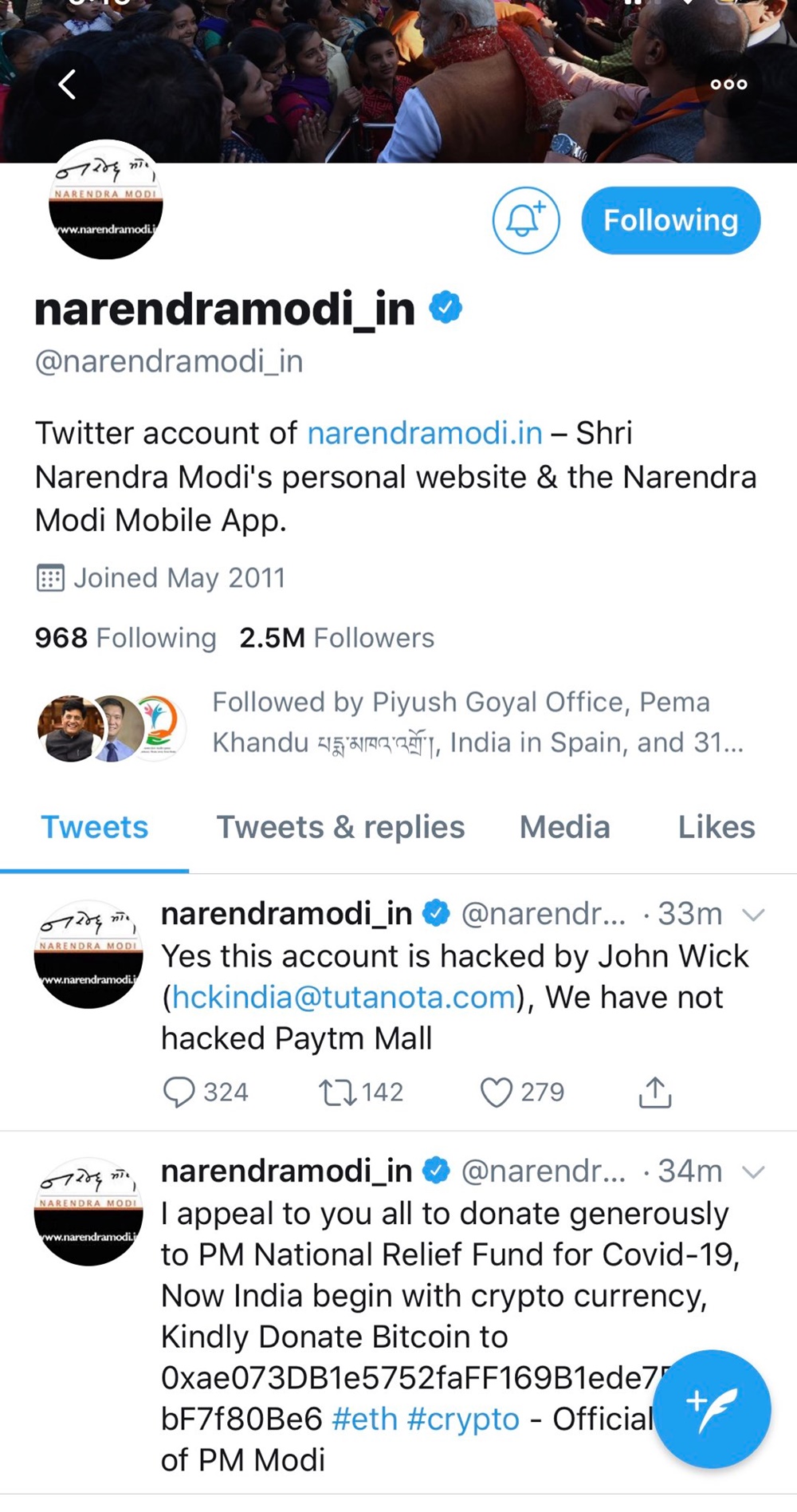নরেন্দ্র মোদীর ব্যাক্তিগত ওবেসাইটের সঙ্গে যুক্ত ওই টুইটার হ্যান্ডলটির নাম ‘নরেন্দ্রমোদী_ইন’। ২০১১-তে খোলা ওই টুইটার হ্যান্ডলে রয়েছে ২৫ লক্ষাধিক ফলোয়ার। বৃহস্পতিবার ভোররাত তিনটে নাগাদ হ্যাক করার পর সেখান থেকে বেশ কয়েকটি টুইট করে হ্যাকাররা। মূলত ক্রিপ্টোকারেন্সির মাধ্যমে প্রধানমন্ত্রীর ত্রাণ তহবিলে টাকা দেওয়ার জন্য আবেদন করা হয়। সেই টুইটের কোনওটাতে বলা হয়েছে, ‘‘আমি আবেদন করছি কোভিড-১৯-এর জন্য প্রধানমন্ত্রী জাতীয় ত্রাণ তহবিলে টাকা দিন। ভারতে এখন ক্রিপ্টোকারেন্সি চালু হল।’’ তার পর বিটকয়েনের মাধ্যমে টাকা দেওয়ার একটি ‘আইডি’ দেওয়া হয়েছে। অপর একটি টুইটে জানানো হয়েছিল, ‘‘এই অ্যাকাউন্ট হ্যাক করেছে জন উইক। আমরা পেটিএম মল হ্যাক করিনি।’’