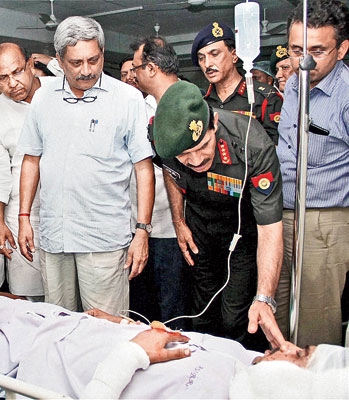 আহত সেনাদের দেখতে হাসপাতালে প্রতিরক্ষা মন্ত্রী মনোহর পর্রীকর এবং সেনাপ্রধান দলবীর সিংহ সুহাগ। ছবি: পিটিআই।