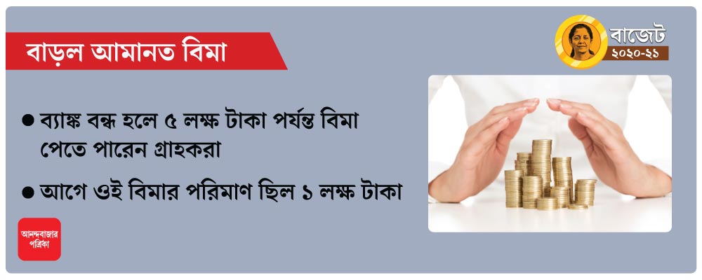 গত বছর, পঞ্জাব অ্যান্ড মহারাষ্ট্র কো-অপারেটিভ (পিএমসি) ব্যাঙ্ক ফেল করার পর আমানতকারীদের জমা রাখা অর্থের সুরক্ষার প্রশ্নটা জোরালো ভাবে উঠতে শুরু করেছিল। এ নিয়ে কেন্দ্রীয় সরকার যে বড়সড় পদক্ষেপ করতে পারে সেই ইঙ্গিত মিলেছিল তখনই। চলতি বাজেটে তাতে সিলমোহর দিলেন কেন্দ্রীয় অর্থমন্ত্রী নির্মলা সীতারমন। জমা রাখা অর্থের বিমা হিসাবে এ বার থেকে গ্রাহকরা ৫ লক্ষ টাকা পর্যন্ত পেতে পারেন বলে এ দিন ঘোষণা করেছেন নির্মলা। এত দিন পর্যন্ত আমানত যত টাকারই হোক না কেন, ব্যাঙ্ক উঠে গেলে গ্রাহকরা ১ লক্ষ টাকা পর্যন্ত পেতে পারতেন। এ বার অবশ্য সেই টাকার পরিমাণ পাঁচ গুণ বাড়ানো হয়েছে।
