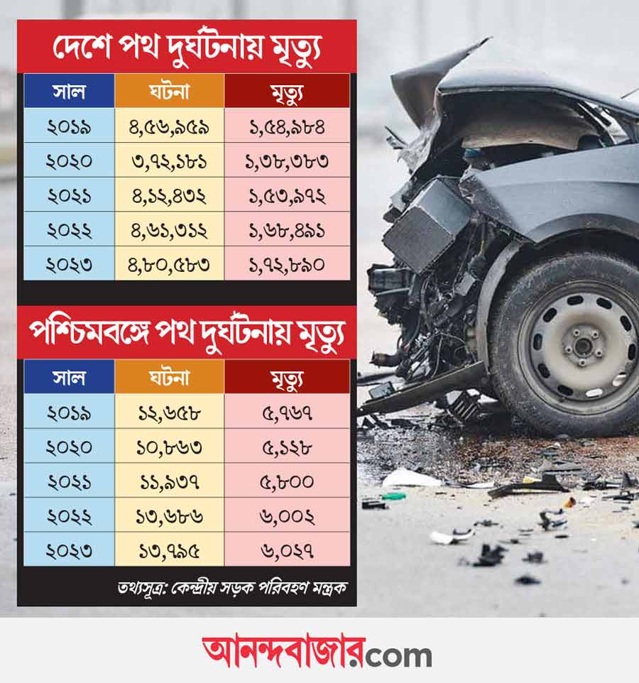 পশ্চিমবঙ্গে ওই বছরে যত দুর্ঘটনা ঘটেছিল, তার মধ্যে প্রায় দু’হাজারটি ঘটেছিল কলকাতাতেই। কেন্দ্রের তথ্য অনুসারে, ২০২৩ সালে কলকাতায় ১,৯৯৪টি পথ দুর্ঘটনায় ১৫৯ জনের মৃত্যু হয়েছিল। দেশের বড় শহরগুলির মধ্যে পথ দুর্ঘটনায় মৃত্যুর দিক থেকে কলকাতা ছিল ৪৪তম স্থানে। পথ দুর্ঘটনায় মৃত্যুর নিরিখে ওই বছর প্রথম স্থানে ছিল নয়াদিল্লি। সেখানে ৫,৮৩৮টি দুর্ঘটনায় ১,৪৫৮ জনের মৃত্যু হয়েছিল। দ্বিতীয় স্থানে ছিল বেঙ্গালুরু। সেখানে ৪,৯৭৪টি পথ দুর্ঘটনায় ৯১৫ জনের মৃত্যু হয়েছিল। পথ দুর্ঘটনায় মৃত্যুর দিক থেকে তৃতীয়, চতুর্থ এবং পঞ্চম স্থানে ছিল জয়পুর, কানপুর এবং প্রয়াগরাজ। এ ছাড়া মুম্বইয়ে ২,৫৩৩টি দুর্ঘটনায় প্রাণ হারিয়েছিলেন ৩৮৪ জন। চেন্নাইয়ে ৩,৬৫৩টি পথ দুর্ঘটনায় মৃত্যু হয়েছিল ৫০৩ জনের।