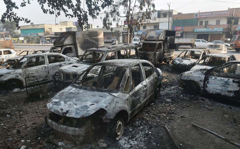 পুণের কাছে অশান্তির আগুনে ছাই সার সার গাড়ি। ছবি: পিটিআই।