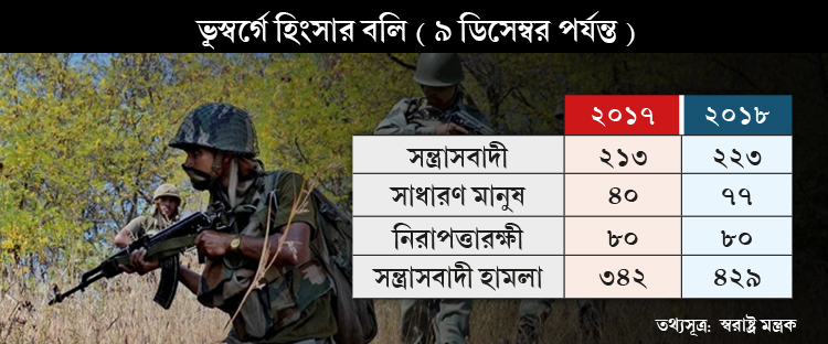 কেন্দ্রীয় স্বরাষ্ট্র মন্ত্রকের তথ্য বলছে,গত ৯ ডিসেম্বর পর্যন্ত উপত্যকায় মোট ২২৩ জন সন্ত্রাসবাদীর মৃত্যু হয়েছে। শেষ আট বছরে যা সর্বাধিক। ২০১৭-য় মোট ৩৪২টি সন্ত্রাসবাদী হামলার ঘটনা ঘটলেও চলতি বছর ৯ ডিসেম্বর পর্যন্ত তা বেড়ে পৌঁছেছে ৪২৯-এ। বেড়েছে সাধারণ মানুষের মৃত্যুর ঘটনাও। ৯ ডিসেম্বর পর্যন্ত সাধারণ মানুষের মৃত্যুর সংখ্যা ছিল ৭৭। শনিবারেরর সাত আর গত এক সপ্তাহে দক্ষিণ কাশ্মীর-সহ উপত্যকার বিভিন্ন প্রান্তে হিংসার ঘটনা মেলালে সেই সংখ্যা এখন ১০০ ছুঁই ছুঁই। ২০১৭ সালে জম্মু-কাশ্মীর উপত্যকায় মোট ২১৩ জন জঙ্গি মারা গিয়েছিল। এ বছর ৯ ডিসেম্বর পর্যন্ত সেই মৃত্যুর সংখ্যা বেড়ে দাঁড়িয়েছে ২২৩, যা শেষ আট বছরে সর্বাধিক। পাশাপাশি জঙ্গিদের হাতে নিহত ভারতীয় নিরাপত্তারক্ষীদের সংখ্যা বেড়ে এখন ৯০-এর কাছাকাছি।শুধু সংখ্যাতত্ত্বের হিসেবেই গত এক দশকের মধ্যে উপত্যকায় সব থেকে বেশি রক্ত ঝরল এই ২০১৮-তেই। যদিও বাস্তব পরিস্থিতি আরও খারাপ বলে জানা যাচ্ছে স্থানীয় সূত্রে।