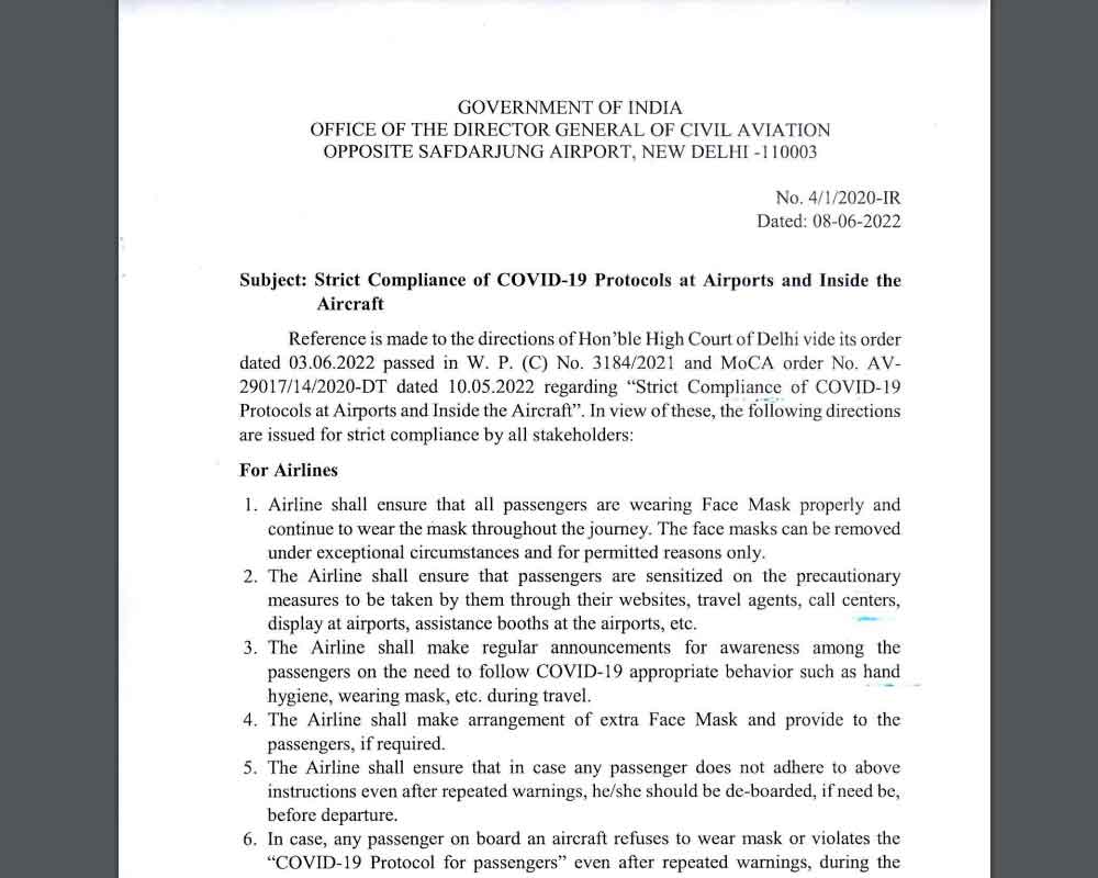 ডিজিসিএ বুধবার জানিয়েছে, যে সব যাত্রী এই নির্দেশ মানবেন না তাঁদের বিমান ওড়ার আগেই বিমান থেকে নামিয়ে দেওয়া হবে। বিমানবন্দরে সুরক্ষার দায়িত্বে থাকা সিআইএসএফ বাহিনীর সদস্যরা লক্ষ রাখবেন কোনও যাত্রী মাস্ক ছাড়া বিমানবন্দরে প্রবেশ করছেন কি না ।
