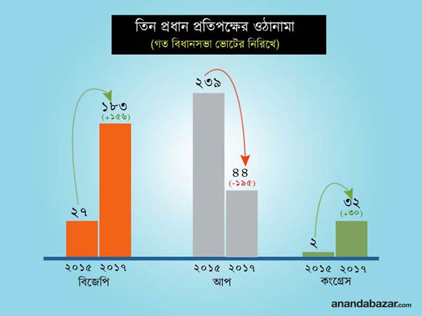 গত বিধানসভা ভোটে দিল্লির তিন পুরসভার মোট ২৭২ ওয়ার্ডের মধ্যে বিজেপি-র লিড ছিল মাত্র ২৭টায়। এ বার তা ১৫৬টা বেড়ে হল ১৮৩। আপ গত বিধানসভা ভোটের ফলে ২৩৯ ওয়ার্ডে এগিয়ে ছিল। এ বার ১৯৫টা কমেছে। কংগ্রেসের লিড ছিল মাত্র দুটোয়। এ বার বেড়ে হল ৩২।