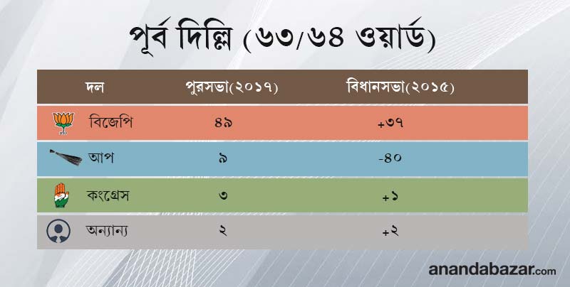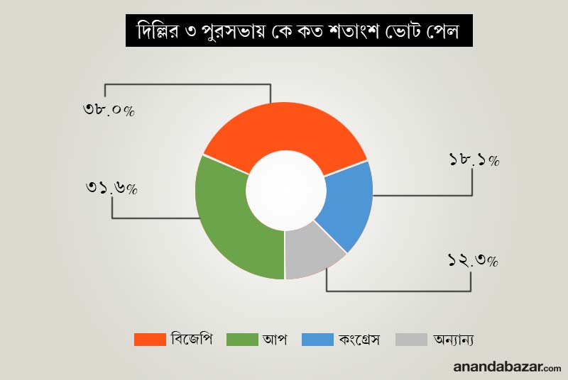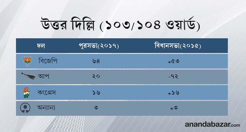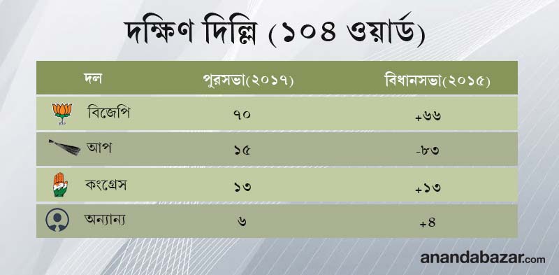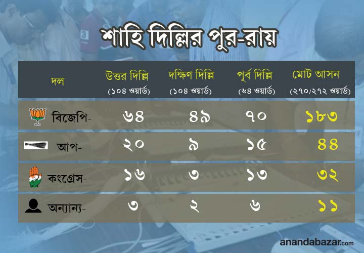 উত্তর দিল্লি পুরসভার ১০৪টি ওয়ার্ডের মধ্যে ভোট হয় ১০৩টিতে। বিজেপি পেয়েছে ৬৪টি। আপ ২০টি। কংগ্রেস ১৬টি। দক্ষিণ দিল্লির ১০৪টির মধ্যে বিজেপি দখল করেছে ৭০টি। আপ ১৫টি। কংগ্রেস ১৩টি। পূর্ব দিল্লির ৬৪টি ওয়ার্ডের মধ্যে ৬৩টিতে ভোট হয়। বিজেপি জিতেছে ৪৯ ওয়ার্ডে। আপ ৯টি এবং কংগ্রেস ৩টি ওয়ার্ডে জিতেছে।