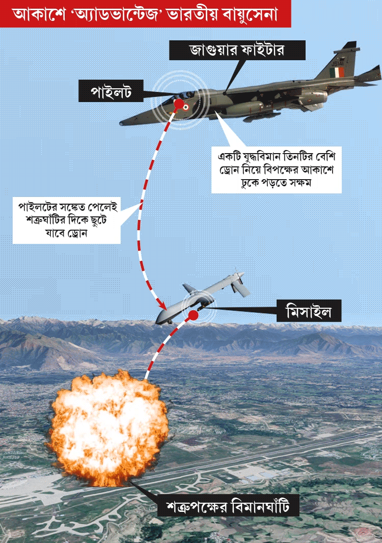 আধুনিকীকরণের ফলে যুদ্ধের জন্য প্রস্তুত অত্যাধুনিক জাগুয়ার যুদ্ধবিমান এবং তার সঙ্গে ক্ষেপণাস্ত্রবাহী চারটি ‘উইংম্যান ড্রোন’। বিপক্ষের বিমানঘাঁটি রাডারে ধরা পড়লেই সেই খবর এই ড্রোনকে এক লহমায় পৌঁছে দেবেন ভারতীয় বায়ুসেনার পাইলট। এর পর সুনির্দিষ্ট লক্ষ্যের দিকে ছুটে যাবে মিসাইলবাহী ড্রোন। বিপক্ষের বিমানঘাঁটি ধ্বংস হওয়া স্রেফ সময়ের অপেক্ষা।