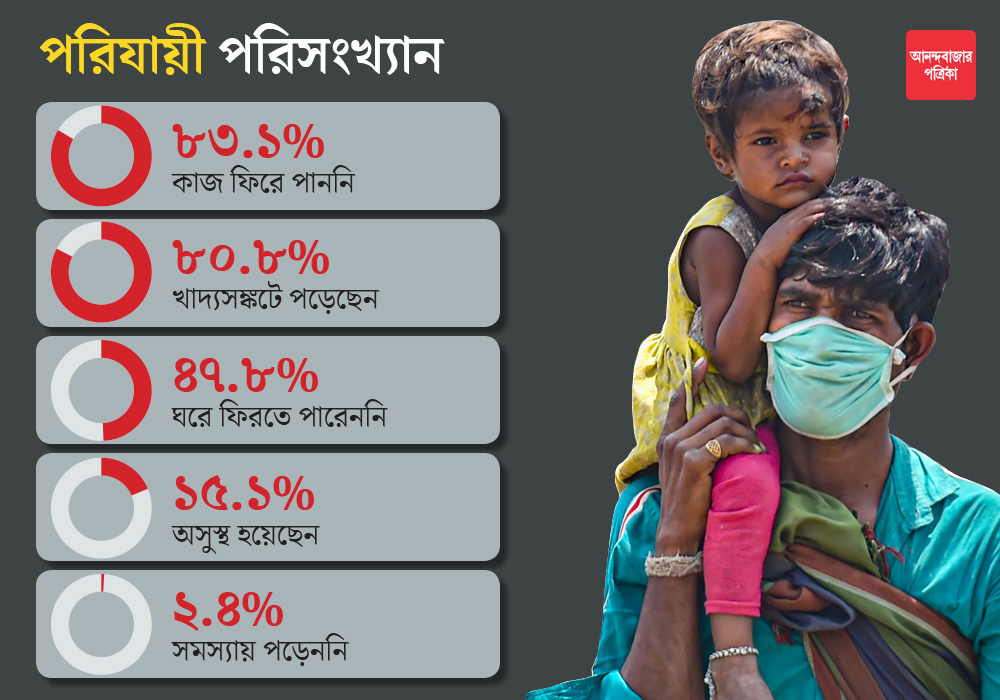 একটি সমীক্ষা বলছে, লকডাউনেকাজ হারানো পরিযায়ী শ্রমিকদের মধ্যে ৮৩.১ শতাংশ মানুষ কাজ ফিরে পাননি। খাদ্যসঙ্কটে পড়েছেন ৮০.৮ শতাংশ মানুষ। ঘরে ফিরতে পারেননি ৪৭.৮ শতাংশ, অসুস্থ হয়েছেন ১৫.১ শতাংশ। সমস্যা এড়াতে পেরেছেন মাত্র ২.৪ শতাংশ পরিযায়ী শ্রমিক।