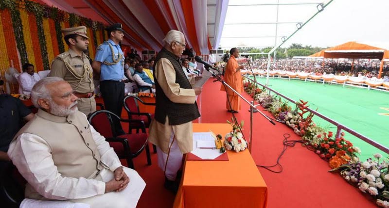 • যোগী আদিত্যনাথকে পদ ও মন্ত্রগুপ্তির শপথ পাঠ করালেন উত্তরপ্রদেশের রাজ্যপাল রাম নাইক।