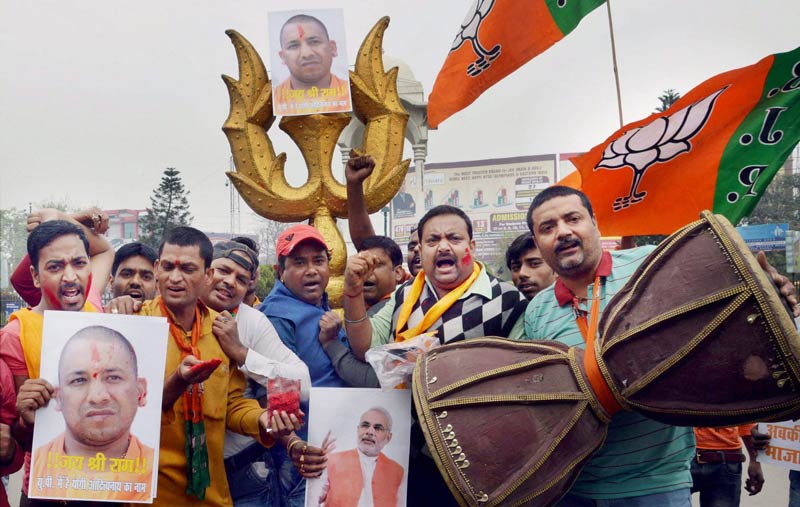 লখনউতে শপথ যোগীর, পটনায় উৎসবে বিজেপি। ছবি: পিটিআই।