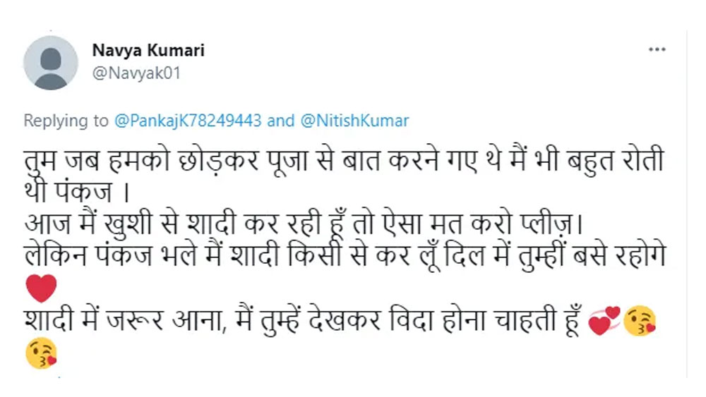 যুবকের নাম পঙ্কজকুমার গুপ্ত। মুখ্যমন্ত্রী নীতীশ কুমারের লকডাউনের মেয়াদ ঘোষণার টুইটে পঙ্কজ রিটুইট করে এমনই আর্জি জানিয়েছেন। সেখানে তিনি লিখেছেন, ‘আপনি যদি বিয়ের উপরও নিষেধাজ্ঞা জারি করেন তা হলে আমার গার্লফ্রেন্ডের বিয়েটাও স্থগিত হয়ে যাবে। ১৯ মে ওর বিয়ে। আপনি যদি বিয়ের উপর নিষেধাজ্ঞা জারি করেন তা হলে কৃতজ্ঞ থাকব’।