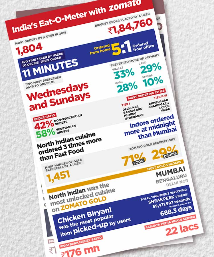 ২০১৮ সালে চাইনিজ, কন্টিনেন্টাল বা অন্যান্য খাবারের তুলনায় জোম্যাটোর দফতরে অনেক বেশি এসেছে উত্তর ভারতীয় খাবারের অর্ডার, এমনটাই জানানো হয়েছে তাদের তরফে। তা ছাড়াও ইঙ্গিত পাওয়া গিয়েছে যে, বিরিয়ানিপ্রেমী ক্রমশ বাড়ছে সারা দেশে। সব থেকে বেশিবার ক্রেতারা অর্ডার করেছেন চিকেন বিরিয়ানিই।