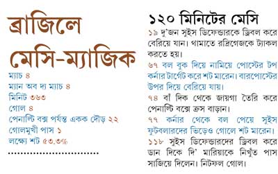 সুইৎজারল্যান্ডের ১-১ করে দেওয়ার অব্যর্থ হেড সাইডপোস্টে লেগে ঝুলে থাকল। ম্যাচের পর দেখছিলাম অ্যাল্পাইন মেসি নামে খ্যাত জারদান শাকিরি-সহ সুইসরা অনেকে কাঁদছেন। কাঁদার মতোই চিত্রনাট্য। দুটো টিম যা সুযোগ পেয়েছিল তাতে মেসিরা ম্যাচটা ২-৩ হেরে ফেরেন। আজই বিশ্বকাপ হয়ে যায় মেসিচ্যুত।