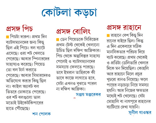 এ দিন রাহানের ব্যাটিংয়ে আরও ছোট একটা পরিবর্তন চোখে পড়েছে। সাধারণত একটু লো বাউন্সের উইকেটে যেটা ব্যাটসম্যানদের অস্ত্র হয়ে থাকে। একটু ঝুঁকে থেকে, ব্যাকলিফট একেবারে কমিয়ে স্পিন খেলা। রাহানেকেও এ দিন দেখা গেল সেই স্ট্র্যাটেজি নিয়েছেন। স্পিনারদের খেলার সময় ব্যাট প্রায় তুলছিলেনই না। আগের ইনিংসগুলোয় যতটা উপর থেকে ব্যাট নামিয়ে উইকেট ট্যাপ করছিলেন, এ দিন অনেক নিচু থেকে ব্যাট ট্যাপ করতে দেখা যায় তাঁকে। বাঙ্গার মনে করিয়ে দিয়ে গেলেন, ‘‘দুটো টেস্টে ব্যর্থ হওয়ার পর রাহানে যে মানসিকতার পরিচয় দিল, সেটা এক কথায় অনবদ্য।’’