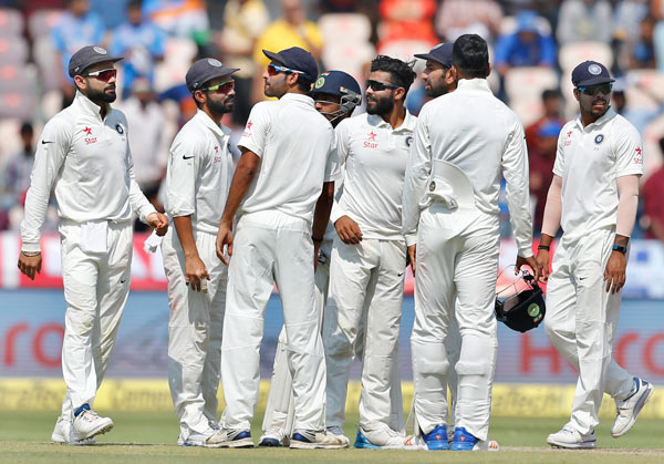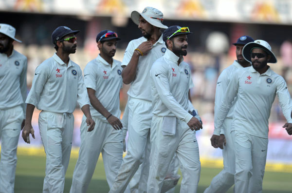টস জিতে প্রথমে ব্যাট করার সিদ্ধান্ত নিয়েছিল ভারত। প্রথম দিন ৩৫৬/৩ থেকে দ্বিতীয় দিন ভারত ইনিংস ঘোষণা করে ৬৮৭ রানে। প্রথম দিন মুরলী বিজয়ের সেঞ্চুরির সঙ্গে সেঞ্চুরির খাতায় নাম লিখিয়ে ফেলা বিরাট কোহালি দ্বিতীয় ডবল সেঞ্চুরিটিও সেরে ফেলেন। তাঁকে যোগ্য সঙ্গত দিয়ে যায় ঋদ্ধিমান সাহার অপরাজিত ১০৬ রানের ইনিংস। দ্বিতীয় দিনের ৪১/১ নিয়ে শনিবার ব্যাট করতে নেমেছিল বাংলাদেশ। ওপেন করতে নেমে আগের দিনই ১৫ রান করে প্যাভেলিয়নে ফিরে গিয়েছিলেন সৌম্য সরকার। আর এক ওপেনার ও তিন নম্বরে ব্যাট করতে নামা মমিনুল হকও দলের ইনিংসকে ভরস দিতে পারেননি। ২৪ রান করে রান আউট হয় তামিম। তার পরই ১২ রান করে এলবিডব্লু হয়ে ফেরেন মমিনুল। চার নম্বরে নেমে হাল ধরতে পারেননি মাহমুদুল্লাহও। ২৮ রানে ফেরেন তিনি। এর পরই জ্বলে ওঠেন সাকিব আল হাসান ও অধিনায়ক মুশফিকুর রহিম। ১০৯/৪ থেকে যখন সাকিব আউট হন তখন বাংলাদেশের রান ২১৬। তাঁর সঙ্গে ততক্ষণে সমানে সমানে লড়াই দিতে শুরু করে দিয়েছেন মুশফিকুর। সাকিব আউট হতেই হাল ধরার কথা ছিল সাব্বির রহমানের। কিন্তু তাঁকে প্যাভেলিয়নে ফিরিয়ে দেন জাডেজা। দিনের শেষে ৮১ রানে মুশফিকুর ও ৫১ রানে মেহেদি হাসান মিরাজ ব্যাট করছেন।