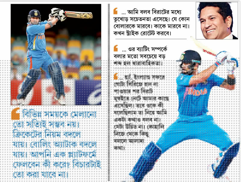 প্র: বিরাট কোহালি সম্পর্কে একটা কথা বারবার বলা হচ্ছে যে তিনি কখনও দায়িত্ব থেকে পালান না। টিমের বোঝা নিজের ঘাড়ে নেন। আমরা আপনার সম্পর্কে লিখতাম, বাকিরা একটা পিচে ব্যাট করে। সচিন ব্যাট করেন দুটো পিচে। একটা নিজের জন্য, টিমের জন্য। আর একটা সমর্থকদের মুখে হাসি রাখার দায়িত্ব নিয়ে। বিরাটের মধ্যে সেই বাড়তি লোড নেওয়ার প্রবণতা কি দেখছেন?