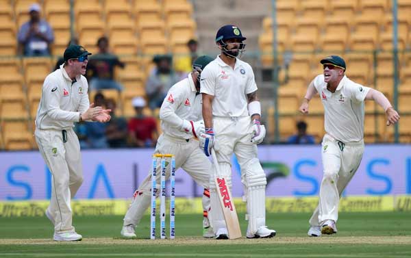 আজ টসে জিতে ব্যাট করার সিদ্ধান্ত নিয়েছিলেন কোহালি। কাঁধে চোট পাওয়া মুরলি বিজয়ের জায়গায় দলে আসা ওপেনার অভিনব মুকুন্দ কোনও রান না করেই মিচেল স্টার্কের বলে এলবিডব্লিউ হয়ে ফিরে যান। দলের রান তখন ১১। প্রথম ডাউনে নেমে পূজারাও বেশ নড়বড়ে অবস্থায় ১৭ রান করে আউট হয়ে যান। ৬৬ বল খেলে লিয়ঁর বলে হ্যান্ডসকম্বের হাতে ক্যাচ দিয়ে প্যাভিলিয়নে ফেরেন পূজারা। লাঞ্চ পর্যন্ত ভারতের রান ছিল ২ উইকেটে ৭২। লোকেশ রাহুল ৪৮ রানে ক্রিজে ছিলেন। লাঞ্চের পর নামেন কোহালি। ১৭ বলে মাত্র ১২ রান করে লিয়ঁর বলে এলবিডব্লিউ হয়ে ফিরে যান ভারত অধিনায়ক। দলের রান তখন ৮৮। ড্রিঙ্কের পর ১৭ রান করে আউট রাহানে। লিয়ঁর বলে স্টাম্প। করুণ নায়ার ২৬ রান করে স্টাম্প হন ওকিফের বলে। অশ্বিন মাত্র ৭ রান করে লিয়ঁর বলে ওয়ার্নারের হাতে ক্যাচ দিয়ে ফিরে যান। ঋদ্ধিমান করেন ১ রান। লিয়ঁর বলে তাঁর ক্যাচ নেন স্মিথ। একই ভাবে আউট রবীন্দ্র জাডেজাও। ৩ রান করে। প্রায় শেষ পর্যন্ত লড়ে ৯০ রান করে আউট হন লোকেশ রাহুল। এর পর ইশান্ত শর্মা নেমে কোনও রান করতে পারেননি। শেষ দুটি উইকেটও নেন লিয়ঁ। শূন্য রানে অপরাজিত থাকেন উমেশ যাদব।