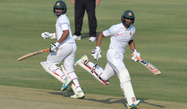 প্রথম ইনিংসে ব্যাট করতে নেমে বাংলাদেশের সামনে রানের পাহাড় তৈরি করেছিল ভারতের ব্যাটসম্যানরা। ওপেনার লোকেশ রাহুল ফর্মের খোঁজে থাকলেও আর এক ওপেনার মুরলী বিজয়ের ব্যাট থেকে এসেছিল সেঞ্চুরি। তাঁকে সেই সময় যথাযোগ্য সঙ্গতল দিয়ে গিয়েছিলেন চেতেশ্বর পূজারা। যাঁর ফলে দু রানে এক উইকেট থেকে ভারত পৌঁছে গিয়েছিল ১৮০/২এ। বিজয়ের ব্যাট থেকে এসেছিল ১০৮ রান। সমান তালে তখন ব্যাট চলেছে পূজারারও। তাঁর ব্যাট থেকে আসে ৮৩ রানের ঝকঝকে ইনিংস। লোকেশ রাহুলের শুরুতেই আউট যে ধাক্কাটা দিয়েছিল সেটা মুহূর্তেই সামলে নিয়েছিল ভারতীয় ব্যাটিং। এর পর তো ভারতের এক ইনিংসে লেখা হল জোড়া সেঞ্চুরি, একটি ডবল সেঞ্চুরি তিনটি হাফ সেঞ্চুরি। যার মধ্যে দুটো ৮০র ওপর। বিরাট কোহালির ২০৪, ঋদ্ধিমান সাহার অপরাজিত ১০৬ তো ছিলই। সঙ্গে ছিল অজিঙ্ক রাহানের ৮২ ও জাডেজার অপরাজিত ৬০ রানের ইনিংস। যার হাত ধরে ভারতের রান পৌঁছে যায় ৬৮৭/৬এ। এখানেই ইনিংস ঘোষণা করে দেন বিরাট।