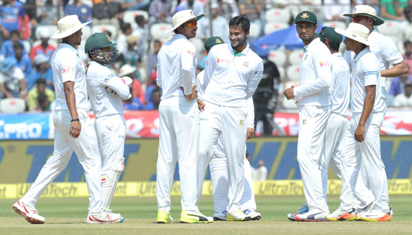 প্রথম ইনিংসে জবাবে ব্যাট করতে নেমে ৩৮৮তেই শেষ হয়ে যায় বাংলাদেশের ইনিংস। প্রথম চার ব্যাটসম্যান তামিম, সৌম্য, মমিনুল ও মাহমুদুল্লাহ ব্যাট হাতে যখন ব্যর্থ হয়ে প্যাভেলিয়নে ফিরে গিয়েছেন তখনই দেশের ইনিংসের হাল ধরেন দলের সব থেকে বিশ্বস্ত সারথি সাকিব আল হাসান। তাঁর দেখানো পথেই সমানে সমানে ততক্ষণে এগোতে শুরু করে দিয়েছেন অধিনায়ক মুশফিকুর রহিম। সাকিবের ৮২ ও মুশফিকুরের ১২৭ রানের ইনিংস যখন ভাল জায়গায় নিয়ে গিয়েছে দলকে তখনই সাকিবের আউটে ছন্দ পতন। এর পর লড়াই দেওয়ার চেষ্টা করেছিলেন মেহেদি হাসান মিরাজ। তাঁর ব্যাট থেকে আসে ৫১ রান। কিন্তু লক্ষ্য থেকে অনেক আগেই থামতে হয় বাংলাদেশকে। এই ইনিংসেই মুশফিকুরের উইকেট তুলে নিয়ে দ্রুততম ২৫০ উইকেটের বিশ্বরেকর্ডও করে ফেলেন রবিচন্দ্রন অশ্বিন।