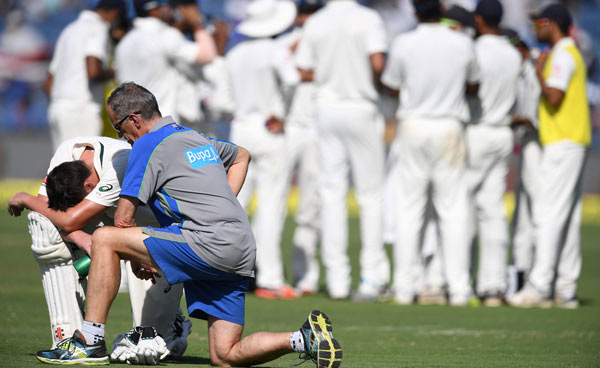 পুণের মহারাষ্ট্র ক্রিকেট অ্যাসোসিয়েশনের স্টেডিয়ামে অসহায় আত্মসমর্পন দেখা গেল ভারতের। টস জিতে প্রথমে ব্যাট করার সিদ্ধান্ত নিয়েছিল অস্ট্রেলিয়া। ২৬০ রানে অস্ট্রেলিয়ার প্রথম ইনিংস গুটিয়ে যাওয়ার পর মনে করা হয়েছিল ভারতীয় স্পিনাররা তাঁদের চেনা ছন্দেই খেল দেখাতে শুরু করে দিয়েছে। কিন্তু উৎসবের ছন্দ পতন ঘটল ভারত ব্যাট হাতে নামতেই। প্রথম ইনিংসে অস্ট্রেলিয়ার ২৬০ রানের জবাবে নেমে ১০৫ রানেই গুটিয়ে যায় বিরাট কোহালিরা। বল হাতে যতটুকু সাফল্য দেখিয়েছিলেন ভারতের বোলাররা ব্যাট হাতে তার মর্যাদাটুকু রাখতে পারলেন না ব্যাটসম্যানরা। প্রথম ইনিংসে ভারতের ব্যাট থেকে এল সর্বোচ্চ ৬৪ রানের ইনিংস। করলেন লোকেশ রাহুল। এর পর ৪৪/৩ থেকে ৯৪/৩। তার পর সাত উইকেট পড়ে গিয়েছিল মাত্র ১১ রানে। দলের ৯৪ রানে প্যাভেলিয়নে ফেরেন লোকেশ। ৯৫-এ পর পর আউট হন রাহানে, ঋদ্ধিমান, অশ্বিন। ৯৮ রানে ফেরেন জয়ন্ত যাদব। ১০১-এ জাডেজার পর ১০৫-এ উমেশ যাদব আউট হতেই শেষ হয়ে যায় ভারতের ইনিংস। ছ’টি উইকেট নিয়ে প্রথম ইনিংসে হিরো অস্ট্রেলিয়ার স্টিভ ও’কিফ।