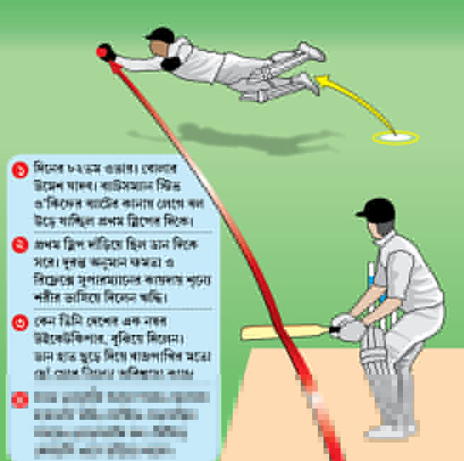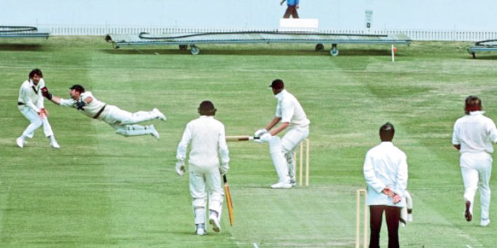ছবিটা অস্ট্রেলিয়ার কিংবদন্তি উইকেটকিপার রডনি মার্শের দুর্ধর্ষ একটা ক্যাচের। ১৯৭৫ বিশ্বকাপ সেমিফাইনালে গ্যারি গিলমোরের বোলিংয়ে রড মার্শ যে ক্যাচ নিয়ে আউট করেছিল টনি গ্রেগকে। টনি গ্রেগ খুব জোরে স্ল্যাশ করেছিলেন বলটা। ব্যাটে লেগে প্রথম স্লিপের দিকে যাওয়া বল মার্শ ডান দিকে অনেকটা ঝাঁপিয়ে তুলে নেন। মার্শ যখন বলটা তালুবন্দি করছেন, তাঁর গোটা শরীরটা হাওয়ায় আর ঠিক মাঠের সমান্তরালে শূন্যে ভাসছে পা দু’টো।