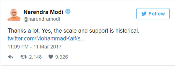 শনিবারই বিপুলভাবে জিতেছে বিজেপি। শুভেচ্ছায় ভরে গিয়েছে প্রধানমন্ত্রী নরেন্দ্র মোদির টুইটার। সেই তালিকায় ছিলেন আরও একজন। বিপুল শুভেচ্ছা বার্তার মধ্যে যে ক’জন মোদির জবাব পেয়েছেন তাঁর মধ্যে তিনিও একজন। তিনি প্রাক্তন ক্রিকেটার মহম্মদ কাইফ। ২০১৫তে মোদির ডাকে স্বচ্ছ ভারত অভিযানে অংশ নিয়েছিলেন কাইফ। কিন্তু তার আগের বছরই ২০১৪তে ফুলপুর থেকে লোকসভা নির্বাচনে কংগ্রেসের হয়ে দাঁড়িয়েছিলেন তিনি। যদিও হেরে যেতে হয়েছিল বিজেপি প্রার্থীর কাছেই। সেই সময় কাইফ বলেছিলেন, ‘‘আমার কেন্দ্রের মানুষের সেবার জন্য আমি ক্রিকেট ছাড়তেও রাজি আছি।’’ কিন্তু হারের পর আবার ক্রিকেটে ফিরেছিলেন কাইফ।
