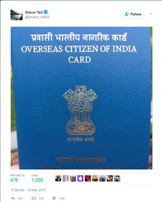 ভারতীয় পাসপোর্ট পেলেন অস্ট্রেলিয়ার ফার্স্ট বোলার শ্যন টেট। ১৫০ কিলোমিটার বেগে বল করার জন্য পরিচিত ছিলেন এই বোলার। ২০১৪ সালে বিয়ে করেন ভারতীয় মডেল মাসুম সিংহকে। ২০১০ সালের আইপিএল থেকেই চলছিল এই দু’জনের প্রেম পর্ব। সেই সময় রাজস্থান রয়্যালসের হয়ে খেলতেন এই অস্ট্রেলিয়ান বোলার। ২০১৪তে বিয়ে করেন। সেই বিয়েতে উপস্থিত ছিলেন যুবরাজ সিংহ ও জাহির খান। শুক্রবার টেট নিজেই টুইট করে জানান তাঁকে, ‘ওভারসিজ সিটিজেন অফ ইন্ডিয়া কার্ড’ দেওয়া হয়েছে। টুইটে সেই কার্ডের ছবিও পোস্ট করেন তিনি।