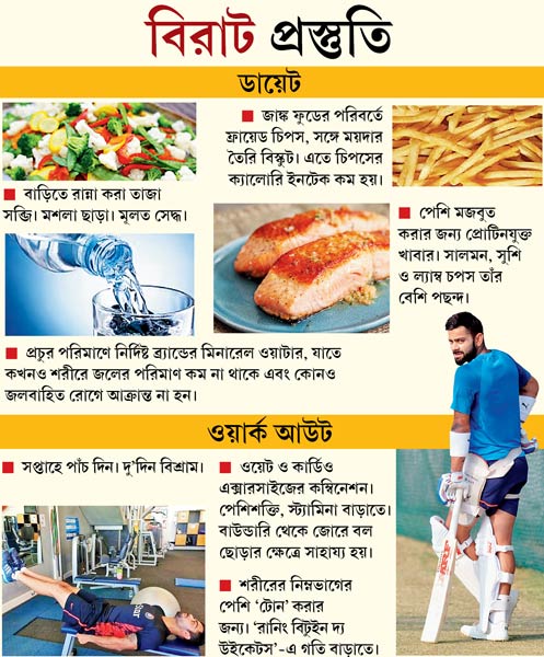 সপ্তাহে পাঁচ দিন কঠিন ওয়ার্ক আউট করার পাশাপাশি ভারতীয় অধিনায়ক তাঁর খাওয়া-দাওয়ার ব্যাপারে এতটাই সচেতন, তা নাকি নিজে না দেখলে বিশ্বাস করা যায় না।