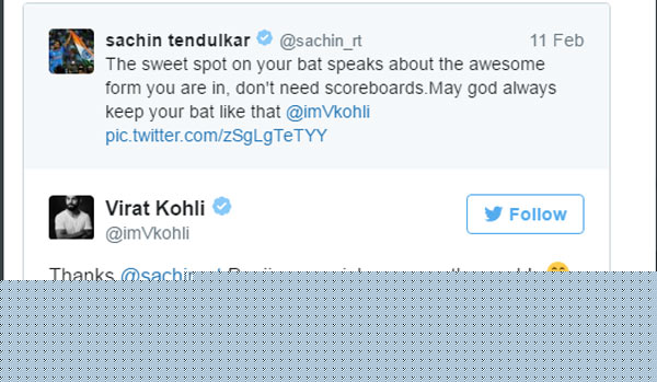 সচিন তেন্ডুলকরের সঙ্গে তাঁর তুলনা হতে শুরু করেছে বেশ কয়েক বছর হয়ে গেল। কিন্তু সচিনের সঙ্গে তাঁর তুলনায় রীতিমতো অস্বস্তিতে পড়ে যান বিরাট কোহালি। এ বার স্বয়ং সচিন টুইট করে তাঁর রেকর্ড স্পর্শের জন্য আগাম শুভেচ্ছা জানিয়ে রাখলেন বিরাটকে। ধন্যবাদ জানিয়ে জবাব দিয়েছেন বিরাটও।