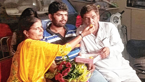 মিষ্টিমুখ। সাক্ষীর মা-দাদা-বাবা। বৃহস্পতিবার। —নিজস্ব চিত্র।
