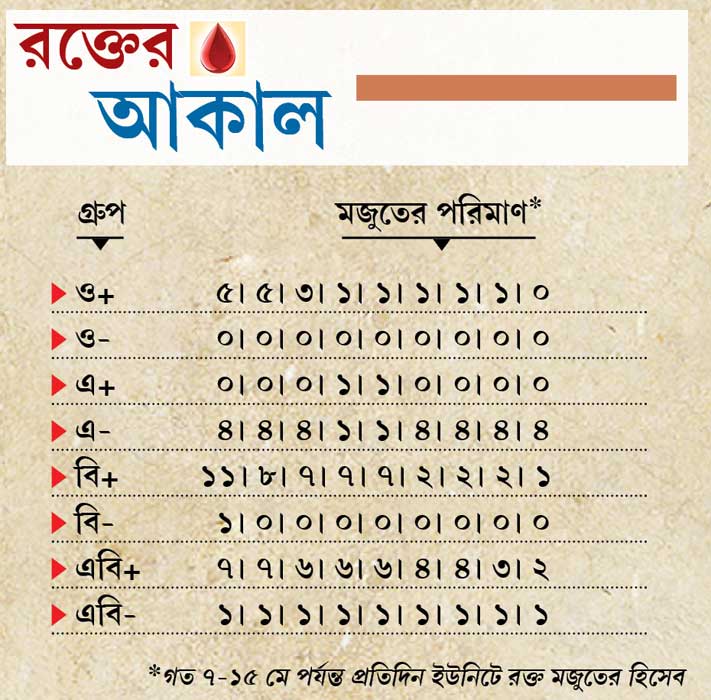 গরম পড়ার সঙ্গে সঙ্গেই রাজ্যের আর পাঁচটা হাসপাতালের মতোই বোলপুর মহকুমা হাসপাতালেও দেখা দিল রক্তের আকাল। ব্লাড ব্যাঙ্কের হিসাব বলছে, হাসপাতালের ব্লাড ব্যাঙ্কের একাধিক গ্রুপের রক্তের টান রয়েছে। তালিকা অনুযায়ী গত এক সপ্তাহে ‘ও’ নেগেটিভ, ‘বি’ নেগেটিভ গ্রুপ্রের রক্ত একেবারে অমিল। চার দিন ধরে নেই ‘এ’ পজিটিভ গ্রুপের রক্তও। এ ক’দিন এক ইউনিট করে ছিল ‘ও’ পজিটিভ গ্রুপের রক্ত। শুক্রবার যা অমিল!