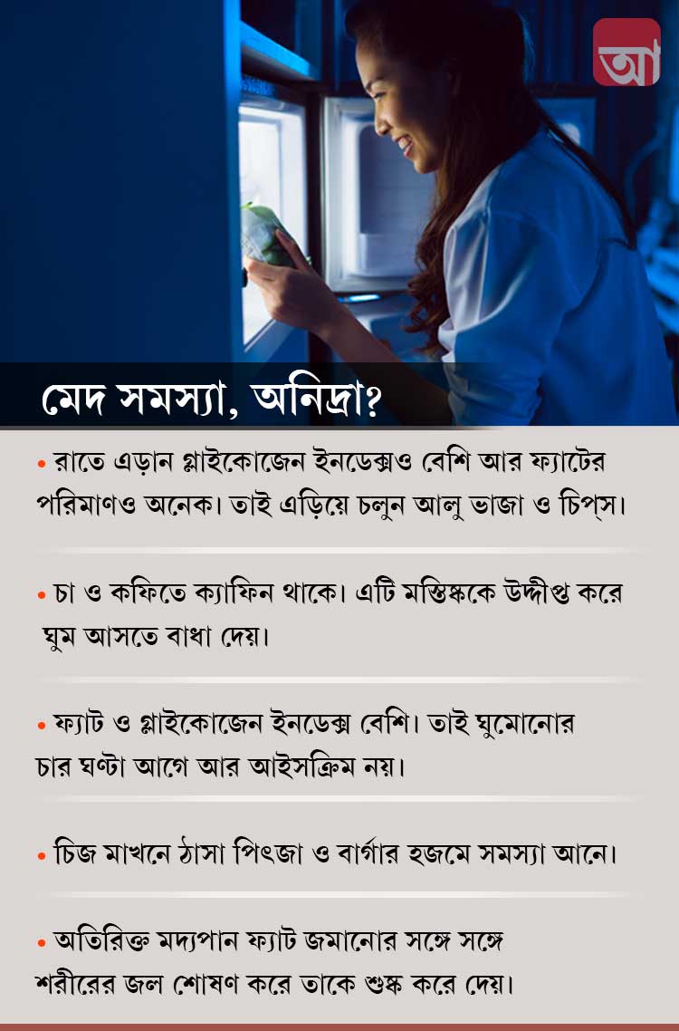 রাতে আমাদের বিপাকহার খুব কম থাকে। তাই খাবার হজম হতে চায় না সহজে। সুতরাং রাতের খাবার নিয়ে খুবই সচেতন থাকা জরুরি। মেদ কমানো থেকে অনিদ্রার উপর নিয়ন্ত্রণ আনা, এর অনেকটাই নির্ভর করে রাতে কী খাচ্ছেন তার উপর। অনেকেরই রাতের খাবার তাড়াতাড়ি খেয়ে নেওয়ার অভ্যাস থাকে। কিন্তু খানিক পরে খিদে পেলে ফের উঁকিঝুঁকি শুরু হয় ফ্রিজে।