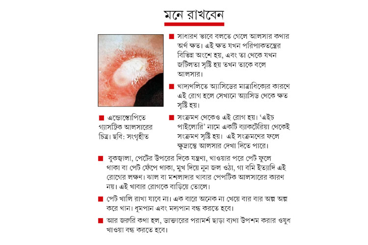 উত্তর: এ বিষয়ে বলে রাখা ভাল, আগে একটা ধারণা ছিল, ঝাল, মশলাদার খাবার খেলেই আলসার হতে পারে। কিন্তু এই ধারণা অনেকটাই ভুল। ঝাল বা মশলাদার খাবার এই আলসারের কারণ নয়। এই খাবার রোগকে বাড়িয়ে তোলে। আপনি যদি পরিপাকতন্ত্রে আলসার রোধ করতে চান, তা হলে, আগে আপনাকে ধূমপান এবং মদ্যপান বন্ধ করতে হবে। পেট খালি রাখা যাবে না। এক বারে অনেকটা না খেয়ে বার বার অল্প অল্প করে খান। আর একটা ভীষণ ভীষণ জরুরি কথা, ডাক্তারের পরামর্শ ছাড়া ব্যথা উপশম করার ওষুধ খাওয়া বন্ধ করতে হবে। আপনি বাতে বা অন্য ব্যথায় কষ্ট পাচ্ছেন, দীর্ঘ দিন দোকান থেকে ব্যথা উপশমকারী ওষুধ খেয়ে কষ্ট লাঘব করছেন, অজান্তে কিন্তু আপনি পেটের মধ্যে এই মারণ রোগ ডেকে আনছেন।