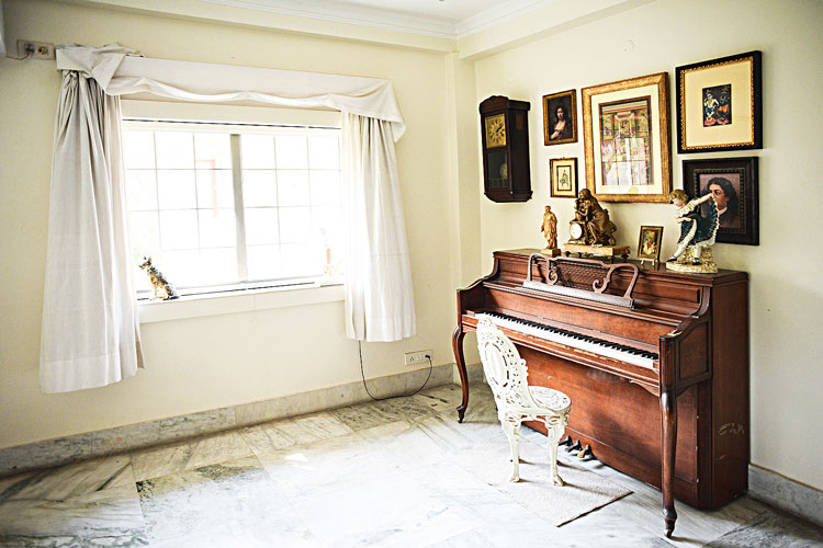 রেওয়াজ-ঘরের একটি বড় অংশ জুড়ে পেল্লায় কাচের দরজা। ঠেলে বাইরে বেরোতেই একফালি বারান্দা। জায়গা অল্প, কিন্তু আয়নার কেরামতিতে দৃষ্টিবিভ্রম হয়। রয়েছে কাস্ট আয়রনের সাদা চেয়ার, ঘরের রঙের সঙ্গেই মানিয়ে। আর সবুজের পরশ। যে দিকেই চোখ যায় স্নেহসবুজ ছোঁয়া। দোতলার বেডরুমটিও খুব বড় নয়, কিন্তু রয়েছে উষ্ণতার আঁচ। পুরনো ভারী কাঠের খাট, পেঁচানো ছত্রী। দু’দিকের জানালা দিয়ে এলোমেলো হাওয়ার অবাধ যাতায়াত। দেওয়ালে তাঞ্জোর পেন্টিংয়ের সরস্বতী। বেডরুমে উজ্জ্বল রং বলতে রঙিন ফুল।