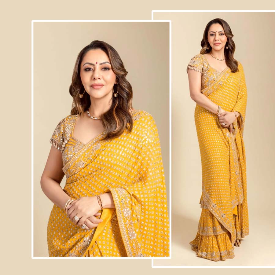 গৌরী খান যা পরেছেন, সেই পোশাকে যেমন রাতের যে কোনও জমকালো অনুষ্ঠানে যাওয়া যাবে, তেমনই সকালের কোনও হালকা অনুষ্ঠানেও যাওয়া যেতে পারে। সর্ষে হলুদ রঙের প্রি-স্টিচড রাফল শাড়ি পরেছেন তিনি। শাড়ির নকশায় জরির কাজ রয়েছে। তা সত্ত্বেও খুব বেশি জমকালো নয়। এ ছাড়া গৌরী শাড়ির জরির কাজের জাঁকজমককে কিছুটা কমিয়েছেন মেকআপেও। সাজের দুনিয়ায় যাকে বলা হয় ‘আন্ডারপ্লে’ করা। মেক আপে বাড়তি কিছু করেননি গৌরী। ন্যুড মেকআপ, ঢেউ খেলানো খোলা চুলে অন্য মাত্রা যোগ করেছে কপালের ছোট্ট লাল টিপ। এ সাজের মন্ত্র একটাই— পোশাক ভারী হলে, হালকা হতে হবে মেকআপ। আর লাল টিপ এ দেশীয় নারীর যে কোনও সাজকে অন্য মাত্রা দিতে পারে।