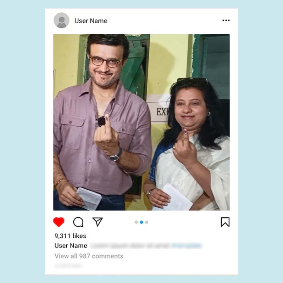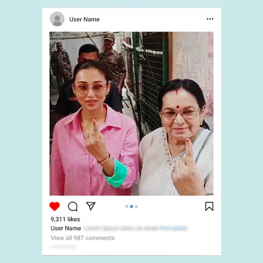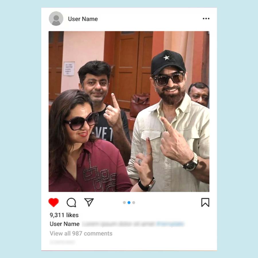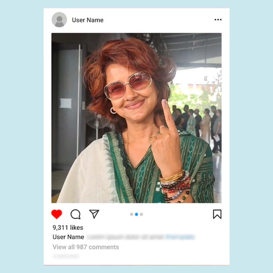 বাবা মায়ের সঙ্গে ভোট দিতে গিয়েছিলেন অঙ্কুশ হাজরা। ক্যাজ়ুয়াল সুতির শার্টের সঙ্গে কালো সিক্সপকেট কার্গো ট্রাউজ়ার্স পরেছিলেন অঙ্কুশ। হাতে ঘড়ি চোখে দৈনন্দিনের চশমা আর পায়ে স্নিকার্স পরা অঙ্কুশকেও একেবারেই নায়কোচিত দেখাচ্ছিল না। তবে নায়িকার মতো দেখতে লাগছিল ঐন্দ্রিলা সেনকে। তিনিও ভোট দিতে গিয়েছিলেন মায়ের সঙ্গে। পরেছিলেন আকাশি ঢিলা জিন্সের সঙ্গে আজরখ প্রিন্টের সুতির লম্বা হাতা টপ আর চোখে সরু সানগ্লাস। খোলা লম্বা চুলে পর্দার মতোই নিখুঁত দেখাচ্ছিল তাঁকে।