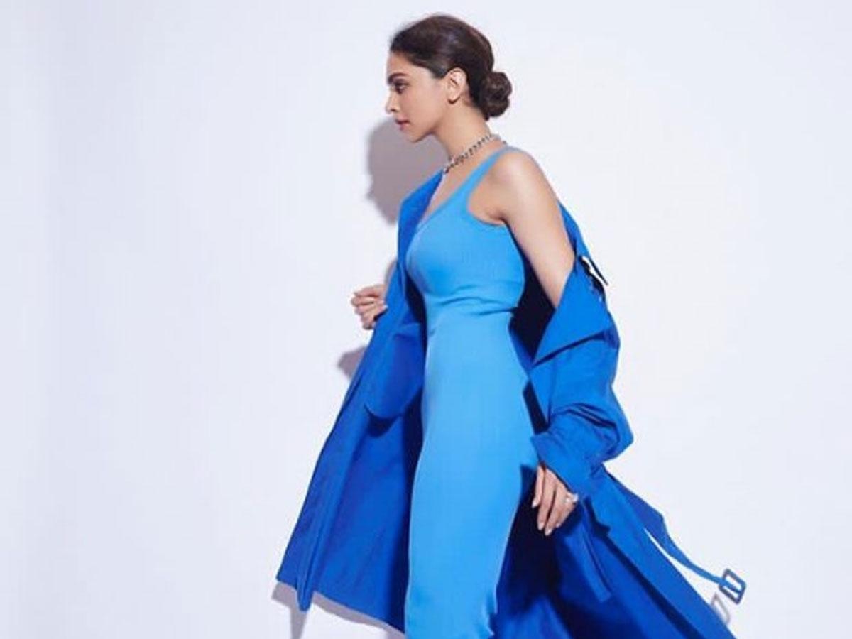 আকাশি রঙের হাতাকাটা হাঁটু ঝুল গাউনের সঙ্গে মানানসই নীলরঙা লম্বাঝুলের কোটে উষ্ণতা নয়, দীপিকা ছড়িয়েছেন প্রশান্তি।