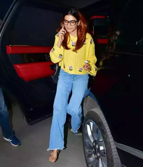 হলুদ উলের সোয়েটারে বেগনি ফুল আর সবুজ পাতার নকশা। খুবই সাধারণ দেখতে জালের নকশা করা ব্যাগি হাতা কার্ডিগান। সামান্থা সেই কার্ডিগানকে স্টাইল করেছেন ফ্লোয়ার্ড এবং ডিস্ট্রেসড হালকা নীল জিন্সের সঙ্গে। হলুদ-নীলের বৈপরীত্য বরাবরই সুন্দর দেখতে লাগে। সামান্থা সেই ক্লাসিক কনট্রাস্টকেই বেছে নিয়েছেন। সঙ্গে হাইলাইট করা খোলা চুল আর মোটা ফ্রেমের চশমায় অন্য রকম কেতাদুরস্ত লাগছে ‘সিটাডেল: হানিবানি’র অভিনেত্রীকে।