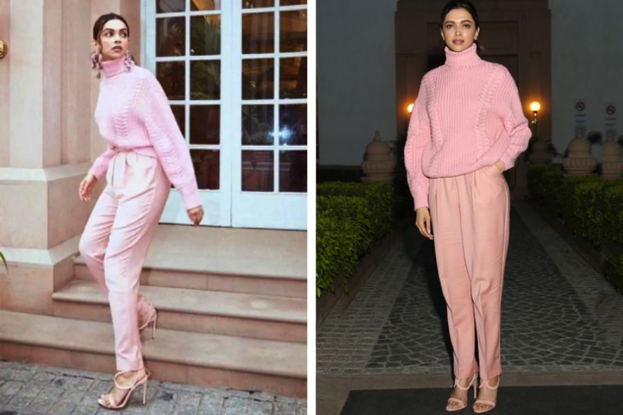 গোলাপি ব্যাগি সোয়েটারের সঙ্গে দীপিকা পরেছেন একই রঙের পেপার ব্যাগ ট্রাউজ়ার। গোলাপি রঙের স্টিলেটোও। আর অদ্ভুত ব্যাপার হল এক রঙে জামা-প্যান্ট-জুতো দেখতে মোটেই একঘেয়ে লাগছে না। সম্ভবত উষ্ণ গোলাপি রঙের জন্যই।