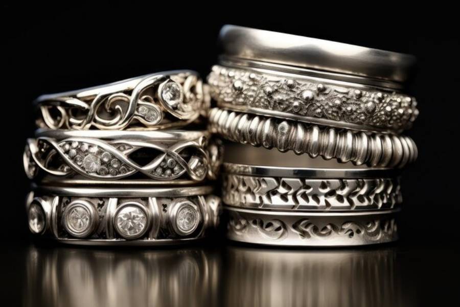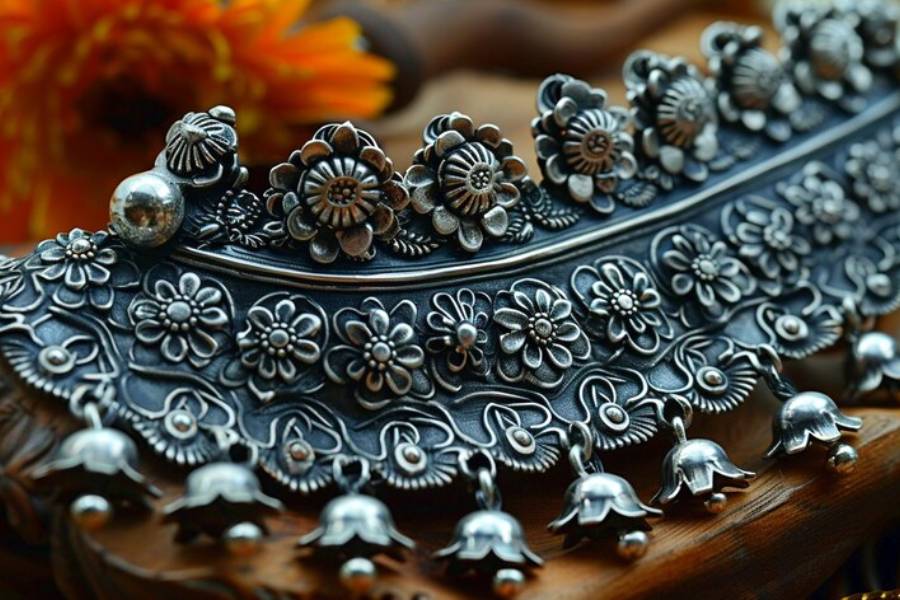 সোনার গয়না এখন ধরাছোঁয়ার বাইরে। রূপোর গয়না অনেকেই সে ভাবে পছন্দ করছেন না। অন্য দিকে, সাধ্যের মধ্যে দাম এবং নানা রঙের এবং ডিজাইনের হওয়ায়, জাঙ্ক জুয়েলারি মেয়েদের প্রথম পছন্দ হয়ে উঠেছে। গলার ভারী হার থেকে হাতের বালা, কানের দুল— জার্মান সিলভারের গয়না সাজকে আরও আকর্ষণীয় করে তুলবে। সাদা জার্মান ধাতুর তৈরি বিরাট বিরাট হাতের বালা, গলার হাঁসুলি, লকেট, পায়ের নূপুর এখন মেয়েদের বেশি পছন্দের।