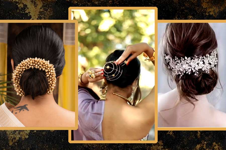 লেহঙ্গার চল বাড়লেও এখনও বিয়ের দিনের সাজের জন্য বাঙালি কনেদের প্রথম বেনারসী শাড়ি। শাড়ির সঙ্গে খোঁপাটা কিন্তু মাস্ট। ফুল দিয়ে খোঁপার সাজ এখন ফ্যাশনে ‘ইন’ নয়, বরং খোঁপাকে নজরকাড়া করতে বেছে নিতে পারেন বাহারি অলঙ্কার। হ্যালফ্যাশনে ‘বান অ্যাক্সেসরিজ’ অর্থাৎ খোঁপার অলঙ্কারের চাহিদা দারুণ। বাঙালি কনেরা যদিও ফুলেল সাজেই সেজে ওঠেন, তবু একটু কায়দা করতে চাইলে খোঁপার অলঙ্কার কিন্তু সাজে চমক আনতে পারে। কুন্দন কিংবা জড়োয়া, মুক্তো কিংবা রকমারি পাথর— খোঁপার অলঙ্কারে বিকল্প পাবেন অনেক।