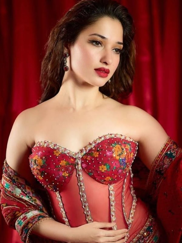তাঁর গায়ের রং অত্যন্ত উজ্জ্বল। তার উপর গাঢ় লাল রঙের লিপস্টিক খুব বেশি ফুটে ওঠার কথা। আধুনিক সাজের দুনিয়া এই ধরনের চরম বৈপরীত্যকে অনেক সময় এড়িয়ে চলে। কারণ, বৈপরীত্যকে এক সুতোয় বাঁধতে পরিশ্রম বেশি। ভুল হয়ে যাওয়ার ঝুঁকিও বেশি। তবে তমন্না সেই ঝুঁকি নিয়েই লাল রঙে রাঙিয়ে নেন ঠোঁট। শাড়ি হোক বা গাউন— যে পোশাকেই সাজুন, লাল রঙে ভয় নেই তাঁর।