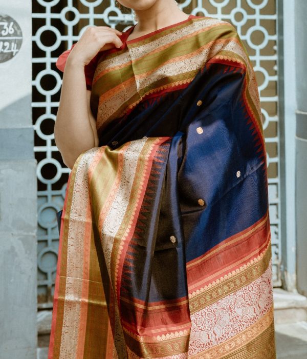 ৭। পাট্টুপেট্টু কাঞ্জিভরম: চওড়া পাড়ে সূক্ষ্ম নকশা আর শাড়ি জুড়ে ছড়িয়ে থাকা ছোট ছোট বুটি। পাট্টুপেট্টু কাঞ্জিভরমকে বুটিদার বা বুটা কাঞ্জিভরমও বলেন অনেকে।
