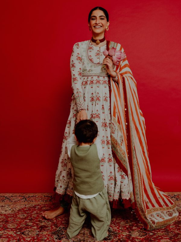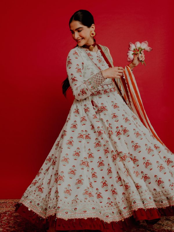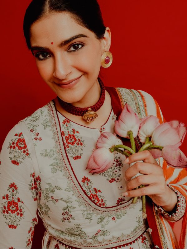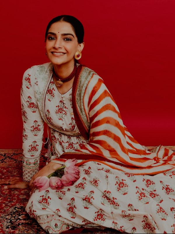 সোনম পরেছিলেন একটি বন্ধ গলা আনারকলি কুর্তা। সাদা রঙের কুর্তার উপর ছোট ছোট লাল ফুলের মোটিফ। আনারকলির ঘেরের বর্ডারের রংও লাল। এমনকি ওড়নাটিও সাদা আর টম্যাটো লালের রং মিলন্তি। কপালে ছোট্ট টিপ, চুলে বিনুনি বাঁধা সোনম হাতে রেখেছেন এক গুচ্ছ পদ্মফুল। কানে পরেছেন চুনি বসানো সোনার কানপাশা, গলায় সোনার চোকার নেকলেস।