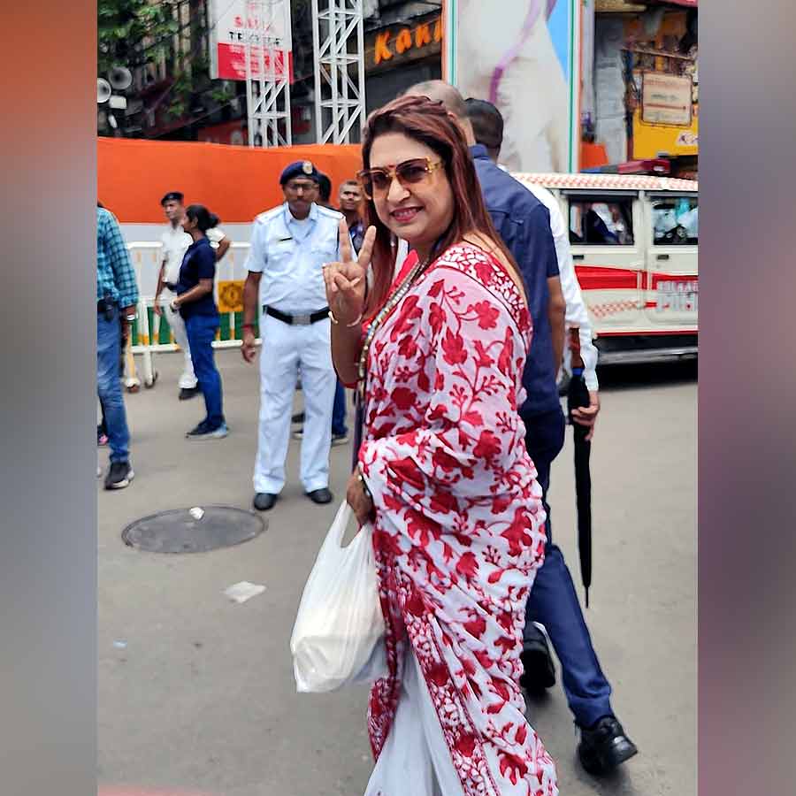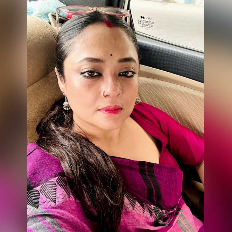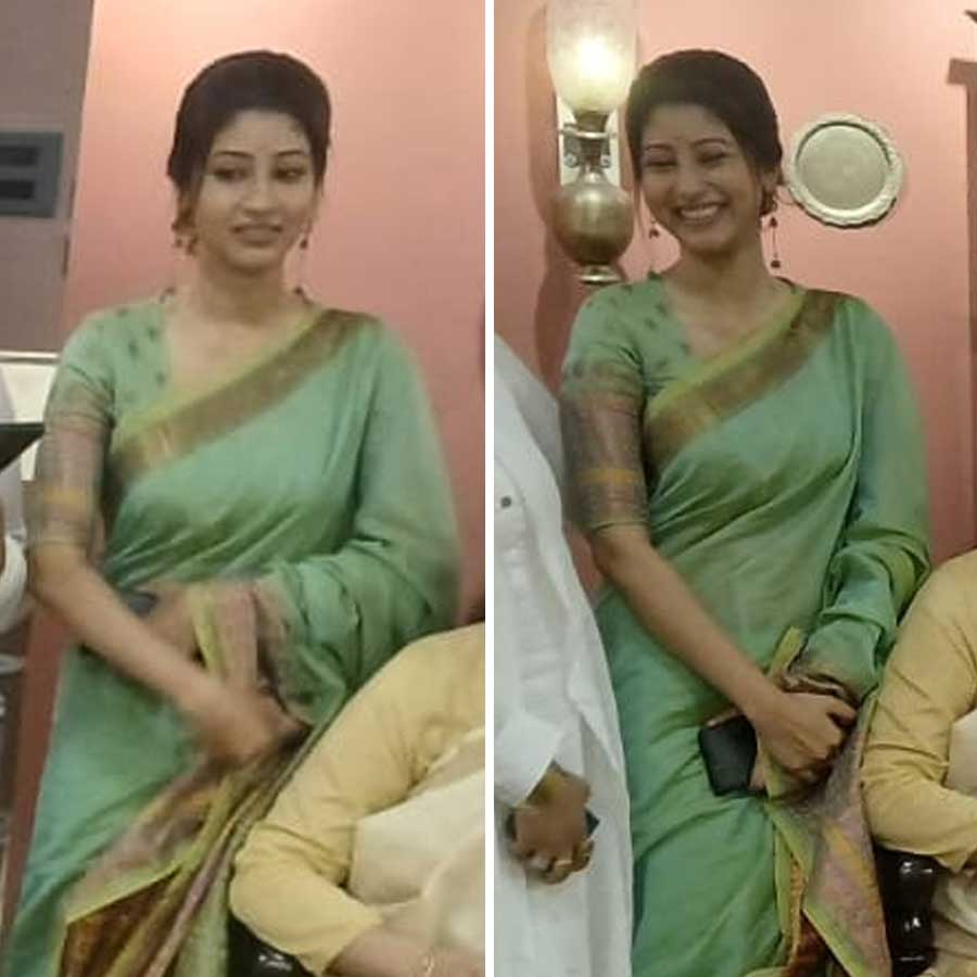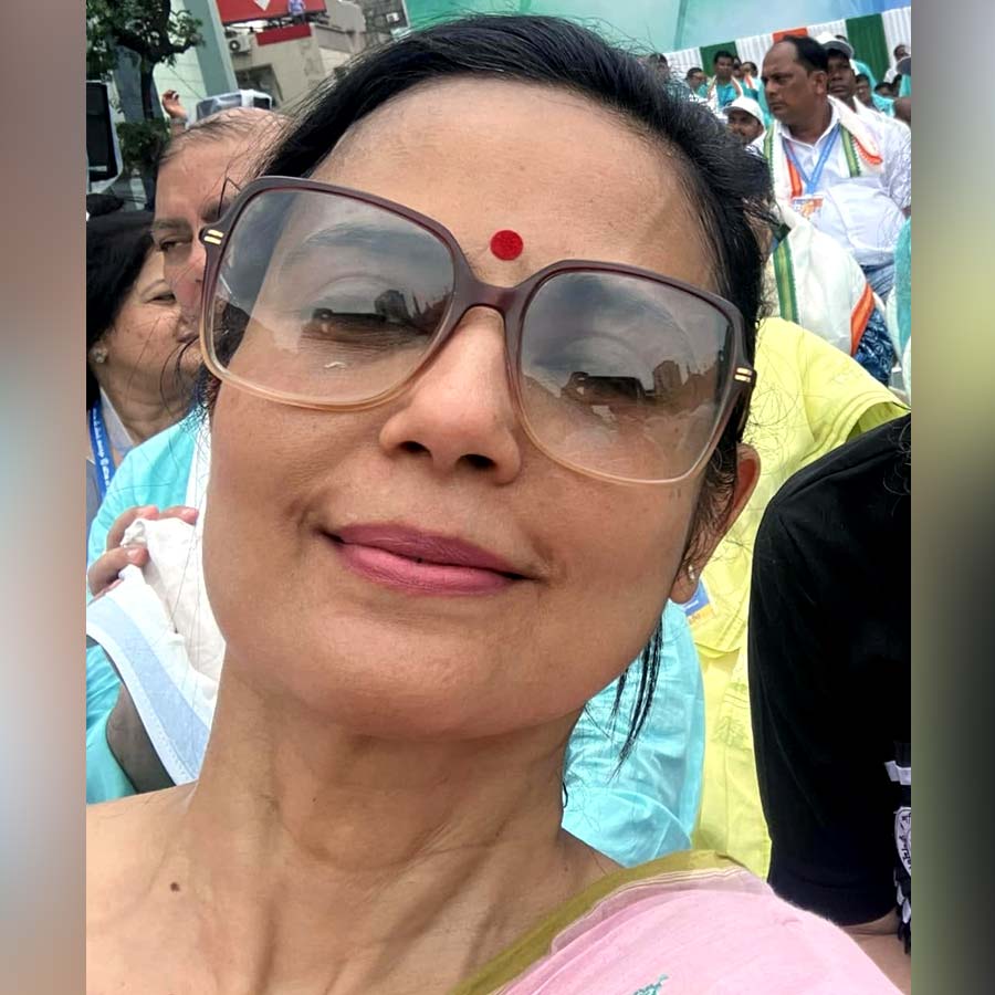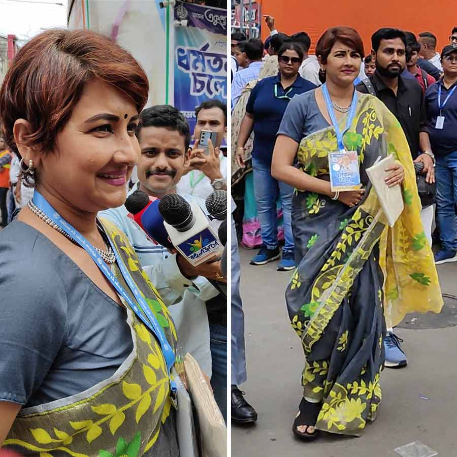 তৃণমূল ছেড়ে বিজেপিতে গিয়েছিলেন রূপাঞ্জনা মিত্র। তিনিও এই ২১ জুলাইয়ের মঞ্চে দৃশ্যমান। বলেছেন, এখানে এসে মনে হচ্ছে খোলা হাওয়ায় শ্বাস নিতে পারছি। সাজেও কি কোনও বার্তা দিলেন? নাহ্, সবুজ পরেননি। পরেছিলেন গাঢ় মভরঙা তাঁতের শাড়ি।